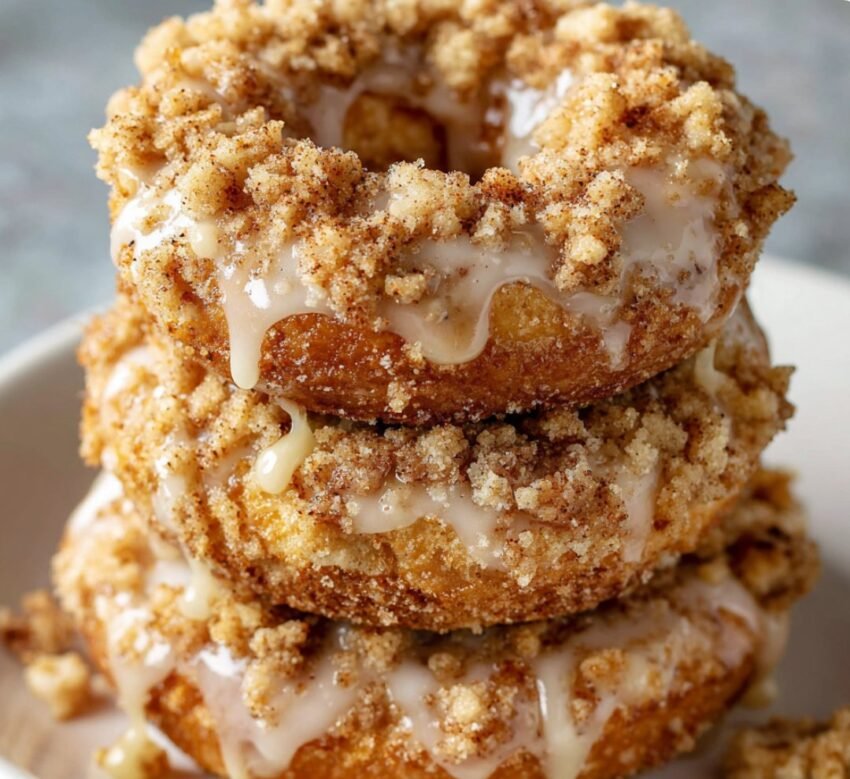 Appearance: Golden donuts with a crumbly top and a light glaze drizzle